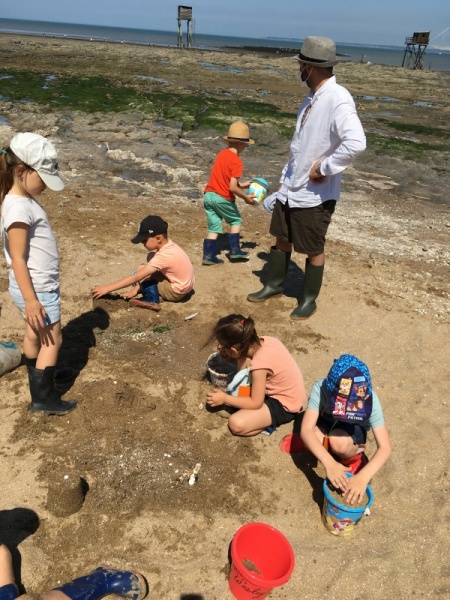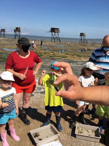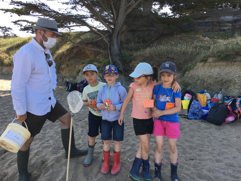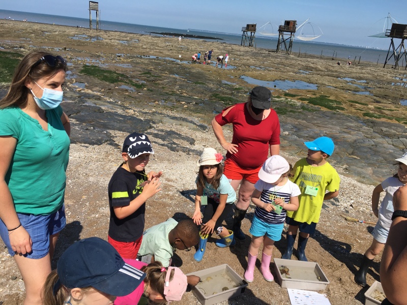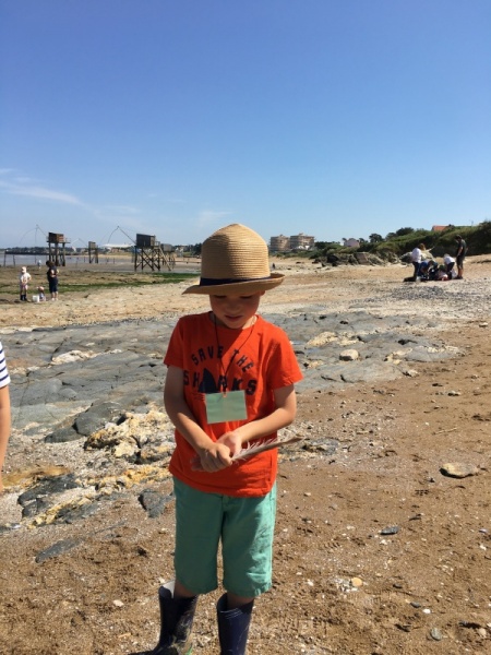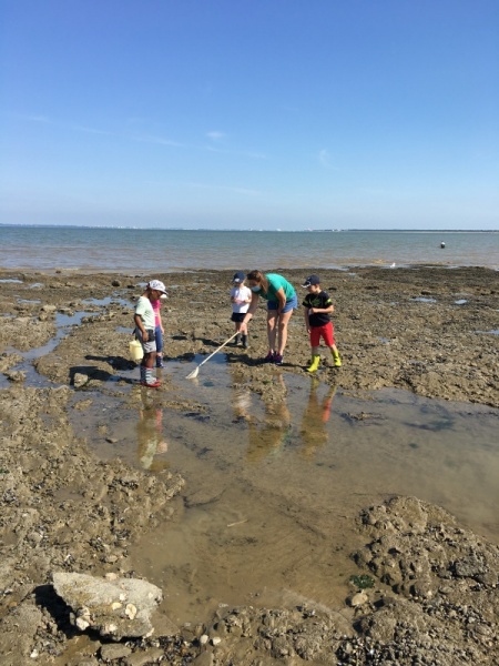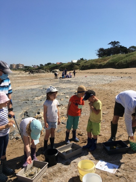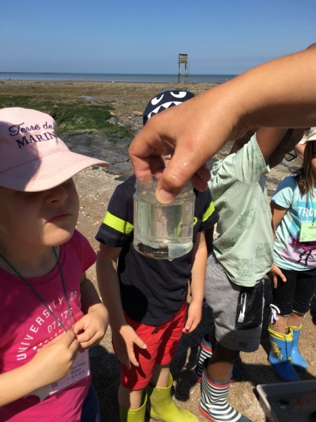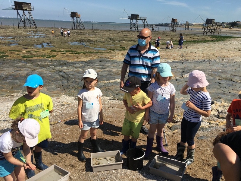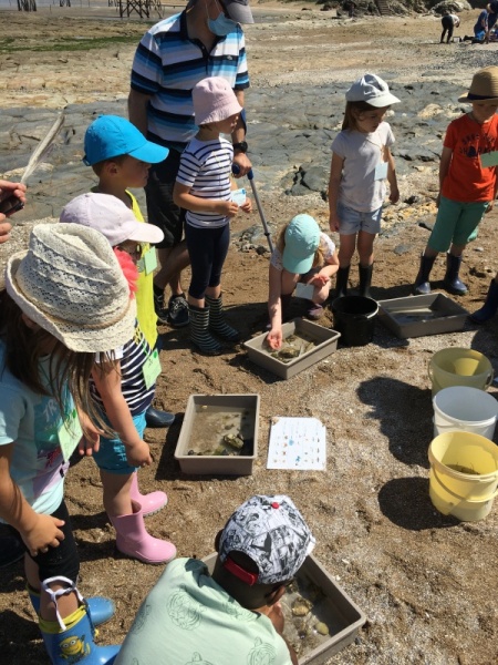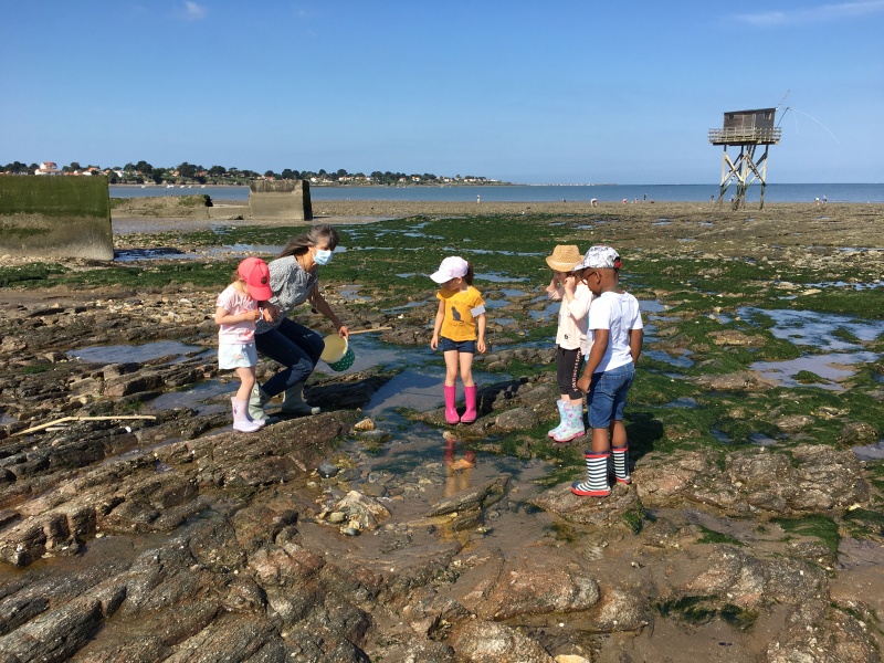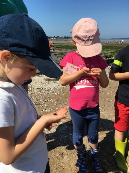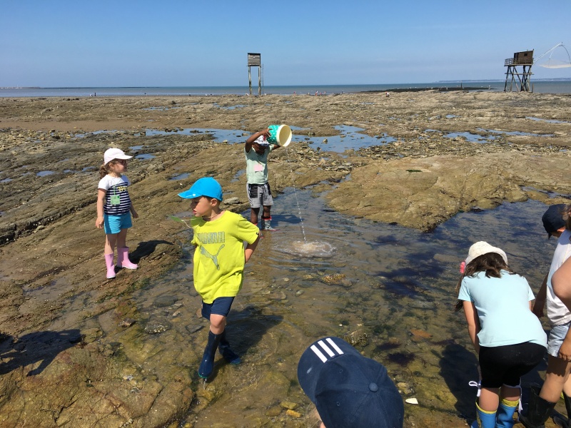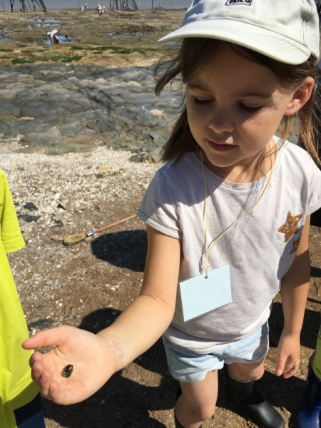 Vendredi 11 juin, nous sommes allés à la plage à Tharon pour découvrir les animaux marins et les trésors de la laisse de mer à marée basse. Le matin, nous avons pêché dans les petites mares au milieu des rochers avec nos mains, une épuisette et un seau. Puis nous avons observé les animaux de notre pêche dans des bacs : des crevettes, des petits poissons, des anémones, beaucoup de crabes de toutes les tailles, des coquillages différents, des petits vers… Nous avons également observé les goélands, mais ils s’envolaient dès qu’on les approchait.