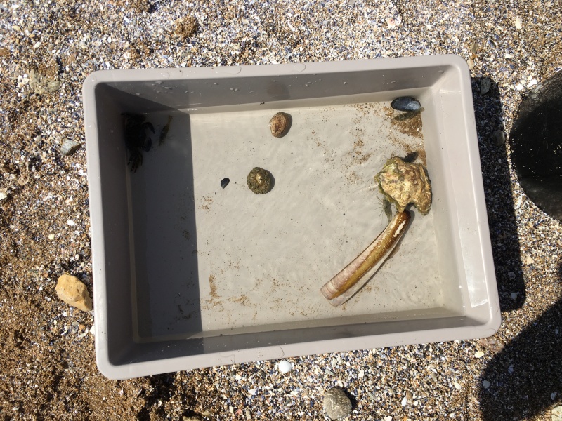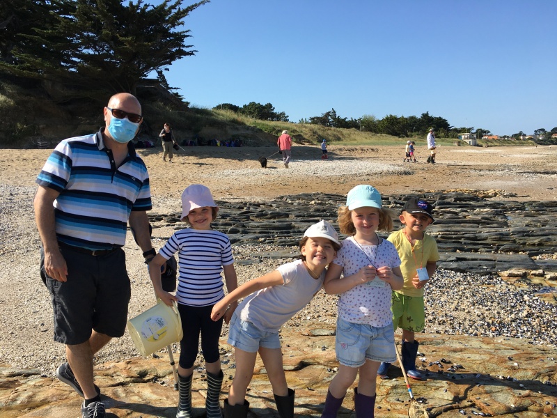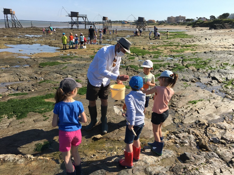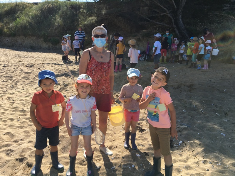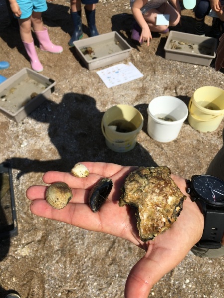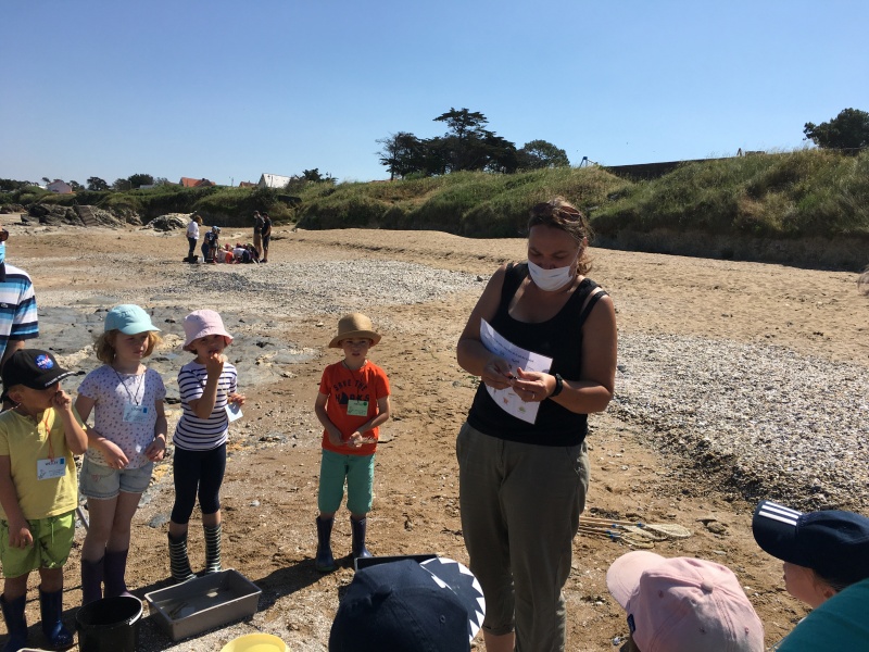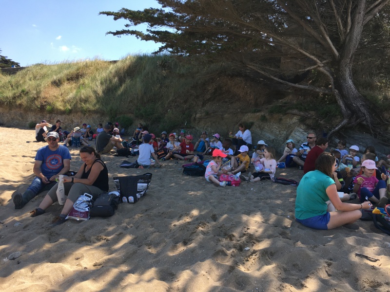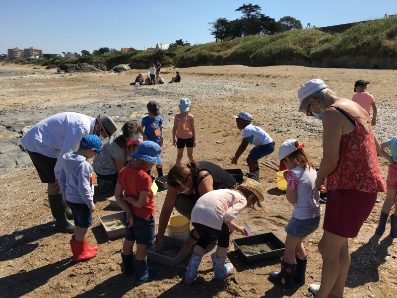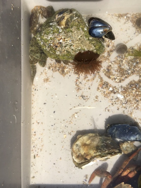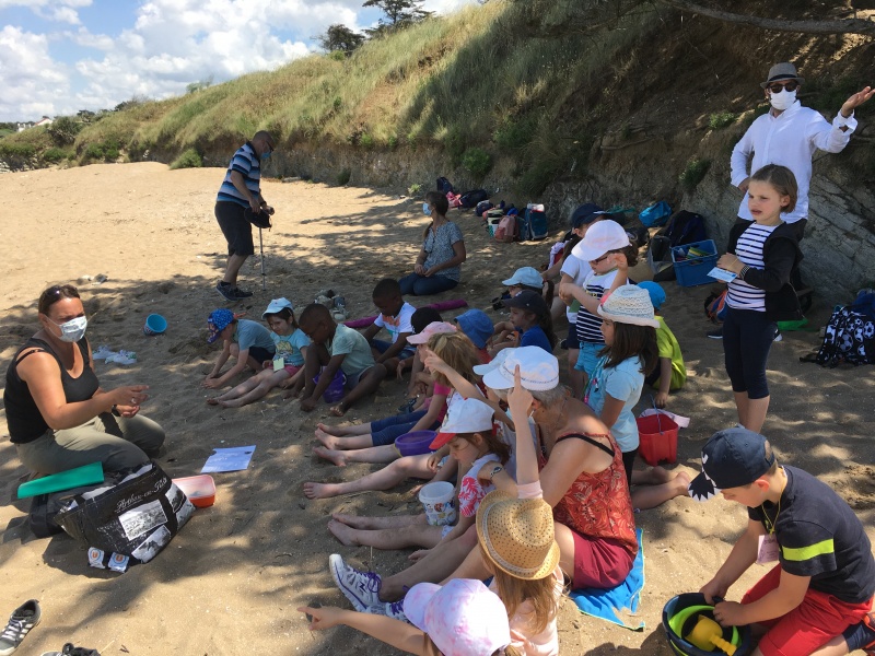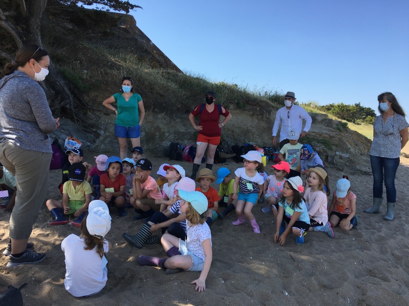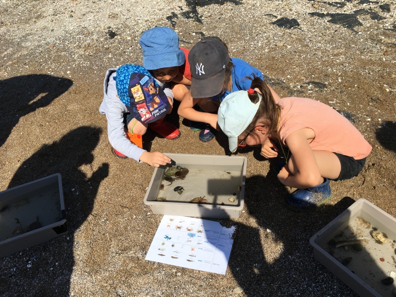 Vendredi 11 juin, nous sommes allés à la plage à Tharon pour découvrir les animaux marins et les trésors de la laisse de mer à marée basse. Le matin, nous avons pêché dans les petites mares au milieu des rochers avec nos mains, une épuisette et un seau. Puis nous avons observé les animaux de notre pêche dans des bacs : des crevettes, des petits poissons, des anémones, beaucoup de crabes de toutes les tailles, des coquillages différents, des petits vers… Nous avons également observé les goélands, mais ils s’envolaient dès qu’on les approchait.