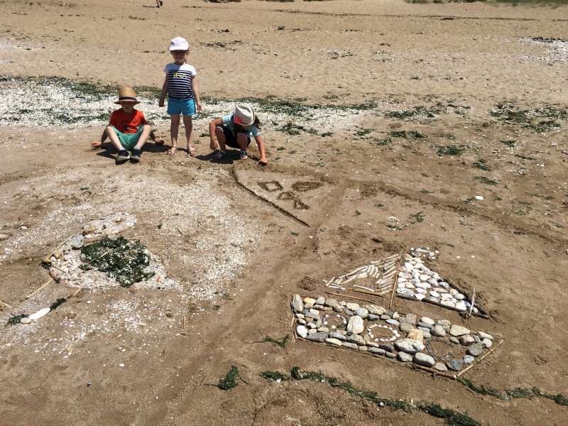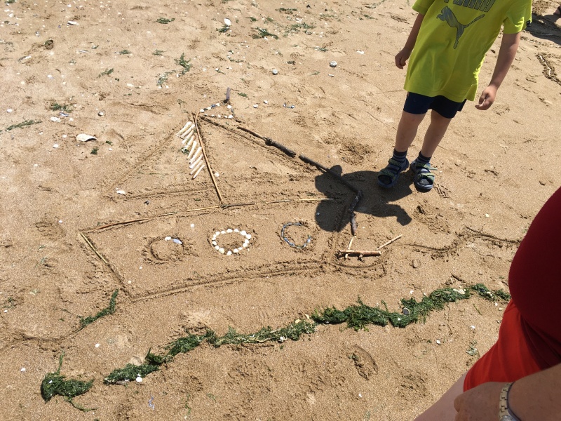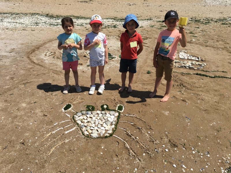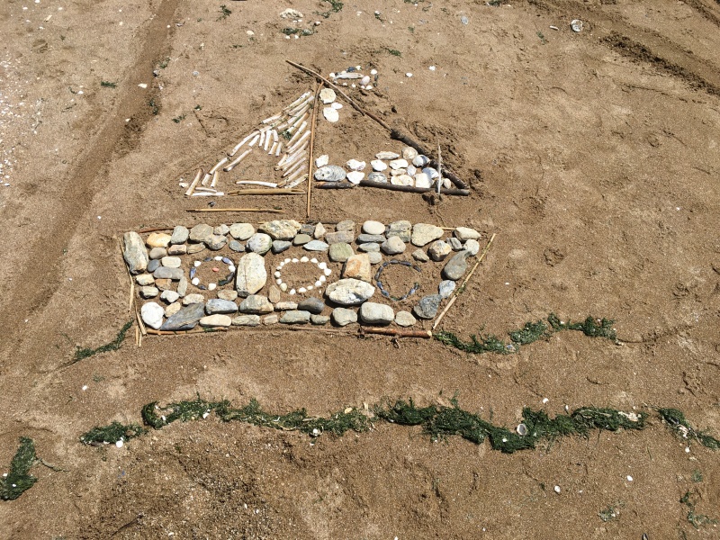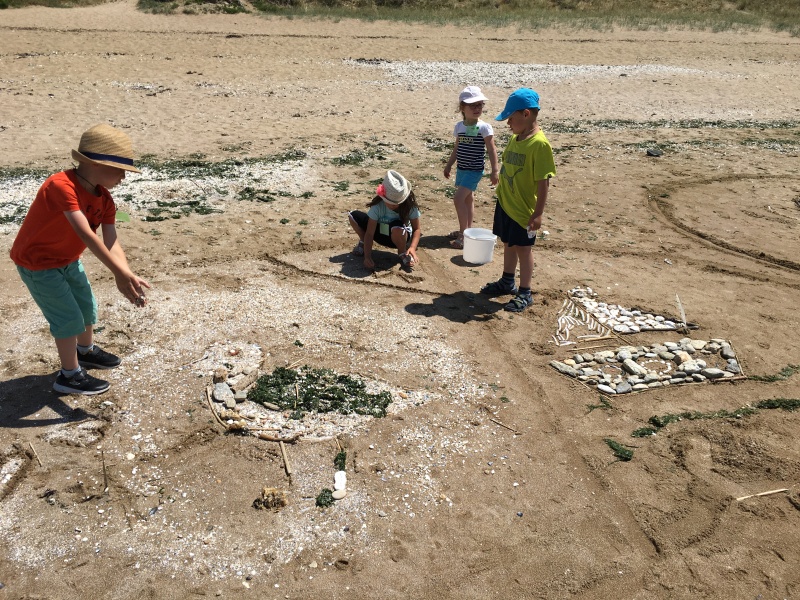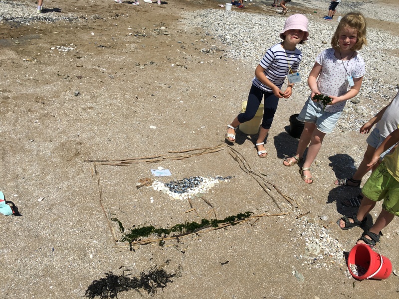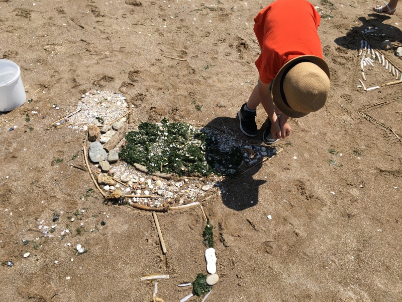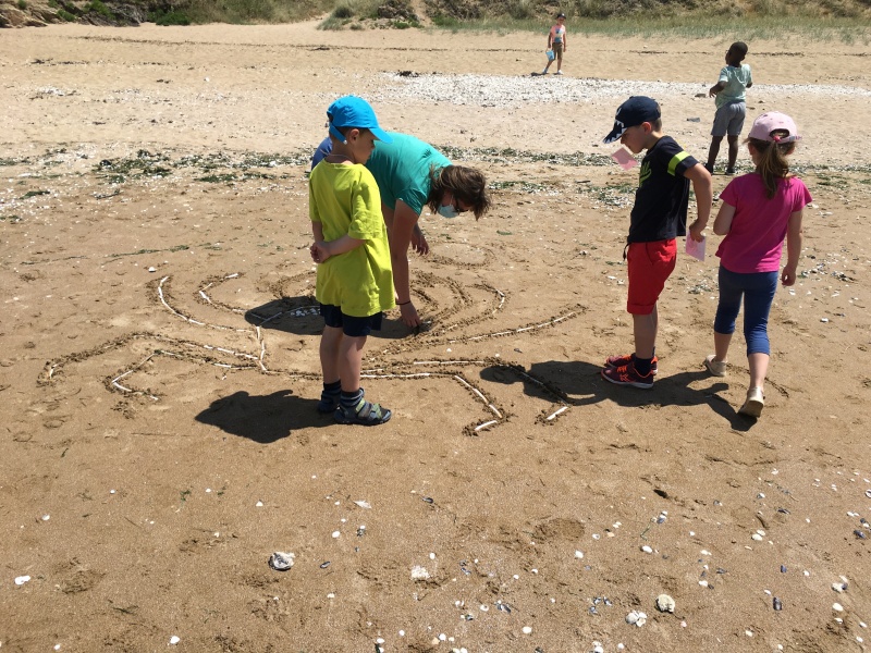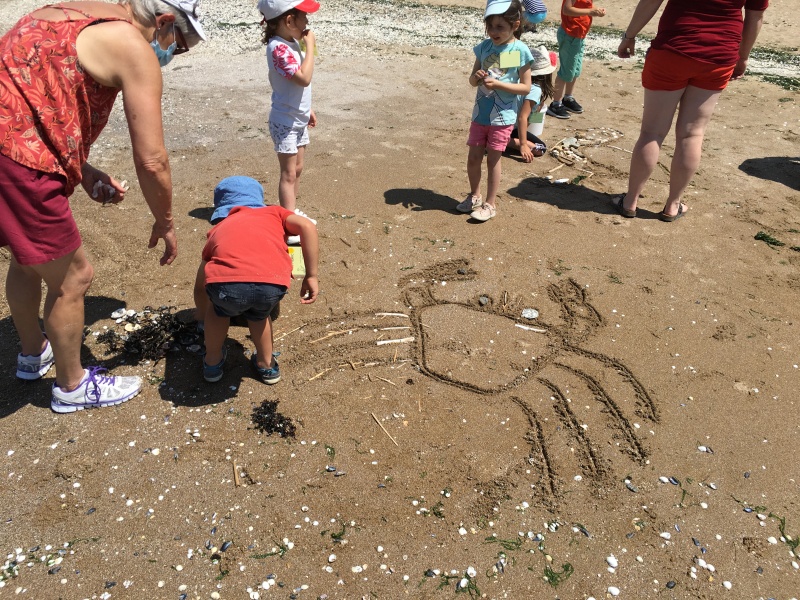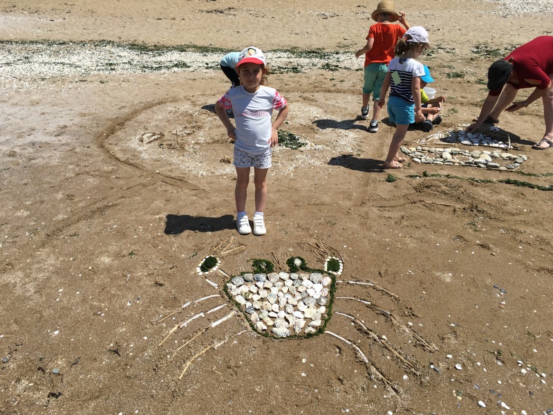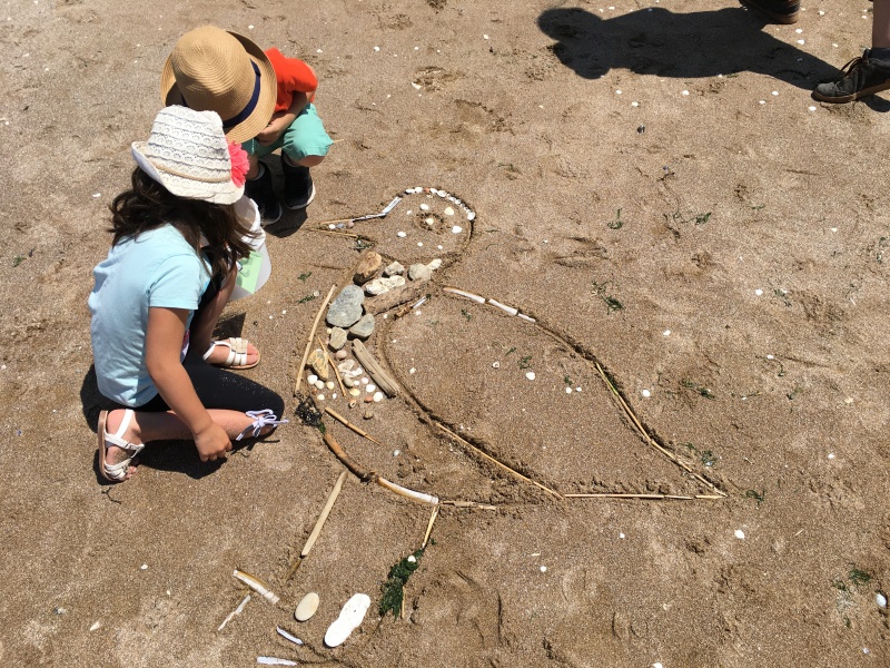 Après le pique-nique, Frédérique, l’animatrice, nous a montré plein de trésors qu’elle avait trouvés sur la plage : du bois flotté, des algues, une capsule d’œuf de raie et une autre d’œuf de roussette, un os de seiche, un morceau de verre poli, une coquille de crabe, un morceau d’étoile de mer et un test d’oursin. Ensuite, nous avons ramassé plein de coquillages, des bouts de bois et des algues pour dessiner sur le sable des oiseaux, des crabes, un poisson, un bateau et une anémone.