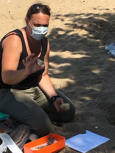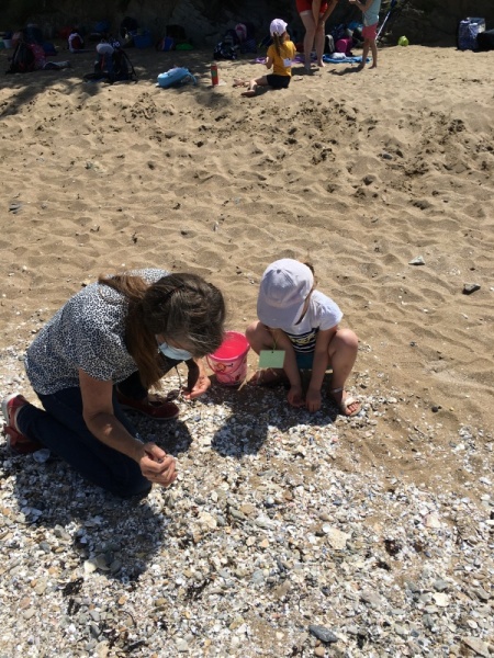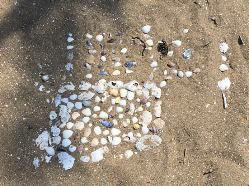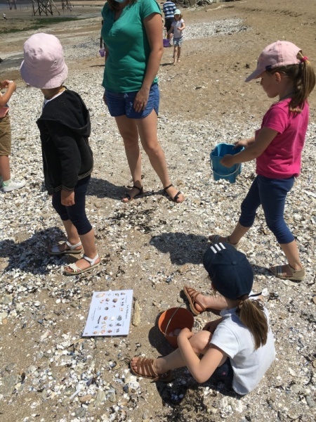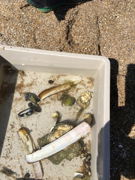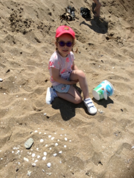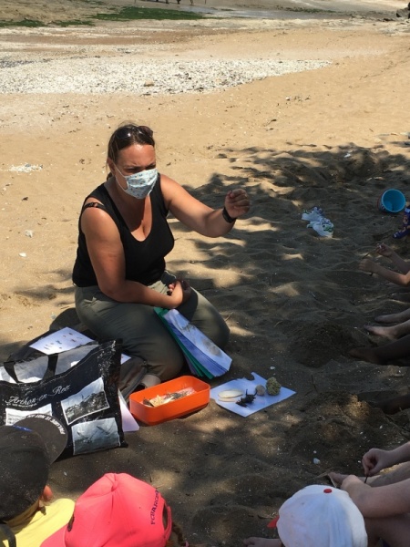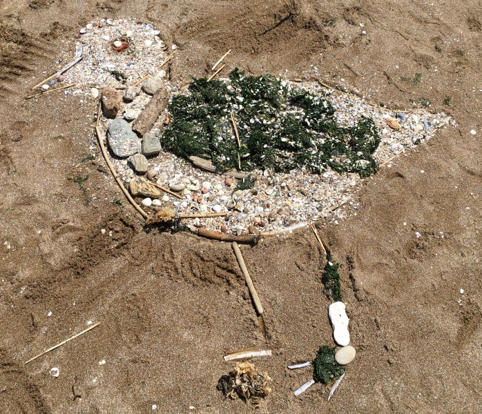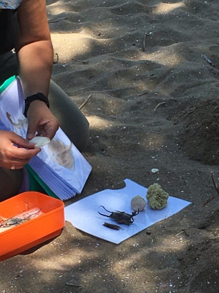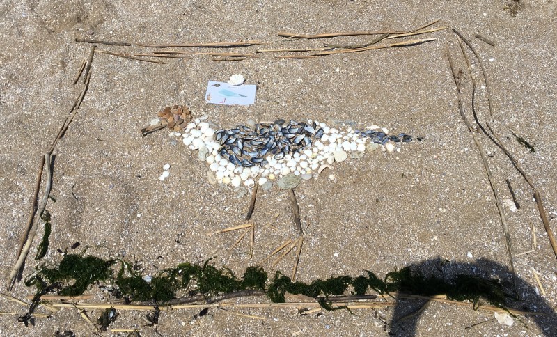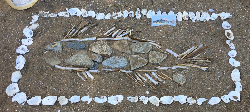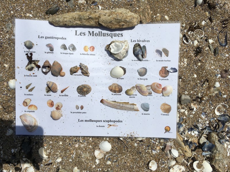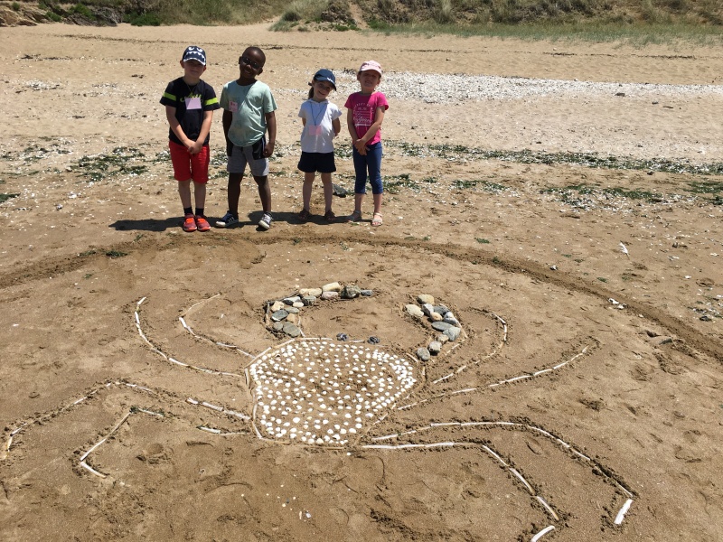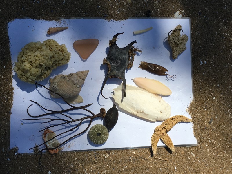 Après le pique-nique, Frédérique, l’animatrice, nous a montré plein de trésors qu’elle avait trouvés sur la plage : du bois flotté, des algues, une capsule d’œuf de raie et une autre d’œuf de roussette, un os de seiche, un morceau de verre poli, une coquille de crabe, un morceau d’étoile de mer et un test d’oursin. Ensuite, nous avons ramassé plein de coquillages, des bouts de bois et des algues pour dessiner sur le sable des oiseaux, des crabes, un poisson, un bateau et une anémone.