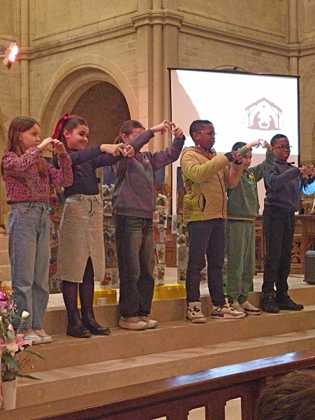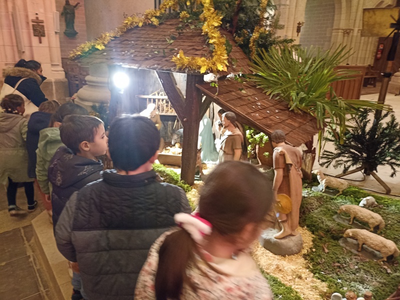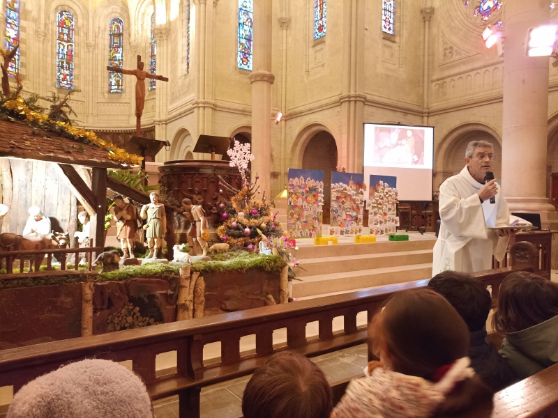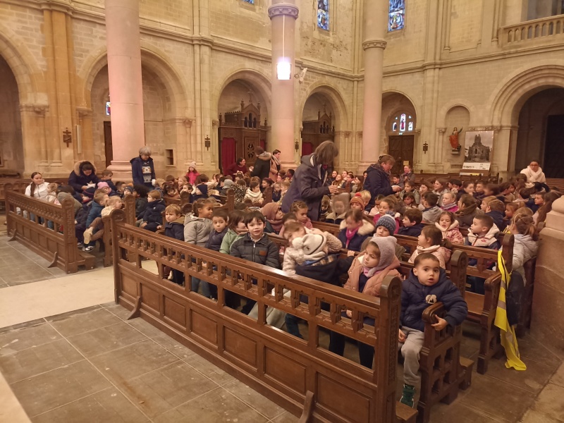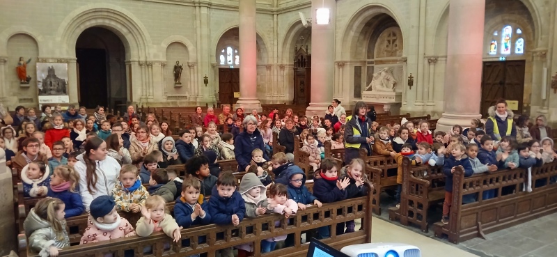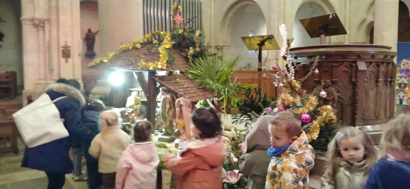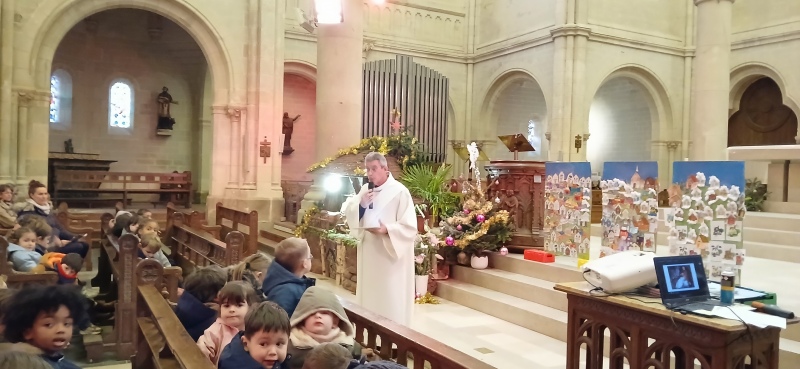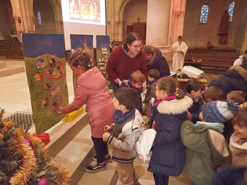 Jeudi matin 18 décembre 2025, toutes les classes sont allées à l’église de BOUVRON pour la célébration de Noël. La célébration était sous le signe de l’hospitalité. Nous avons chanté « Mon cœur est ta maison ! » et avons réalisé un beau village de maisons ! Nous avons écouté un conte de Noël qui nous expliquait la joie de l’accueil et nous avons écouté le récit de la nativité.