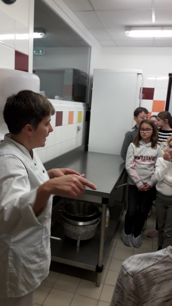 Nadia nous a fait visiter les cuisines. On a suivi le chemin de « la marche en avant » pour que les aliments sales ne croisent pas les aliments propres.