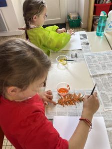 Au mois de novembre, nous avons fait des empreintes de feuilles pour recréer une forêt et nous avons fait des confettis avec des feuilles ramassées puis séchées pour symboliser les feuilles tombées.